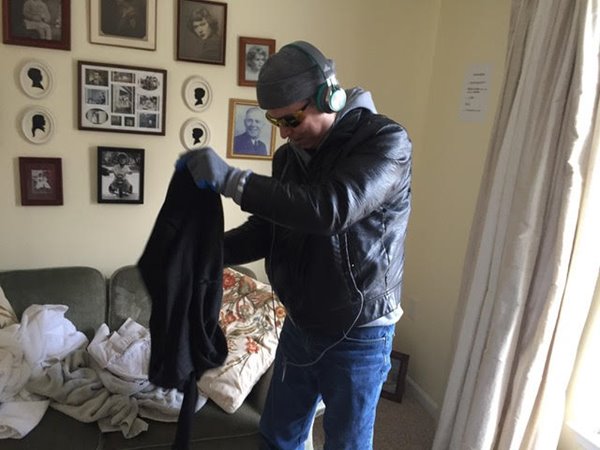 Paul, in his dementia “garb” struggling to complete an everyday activity in “Susie’s living room."